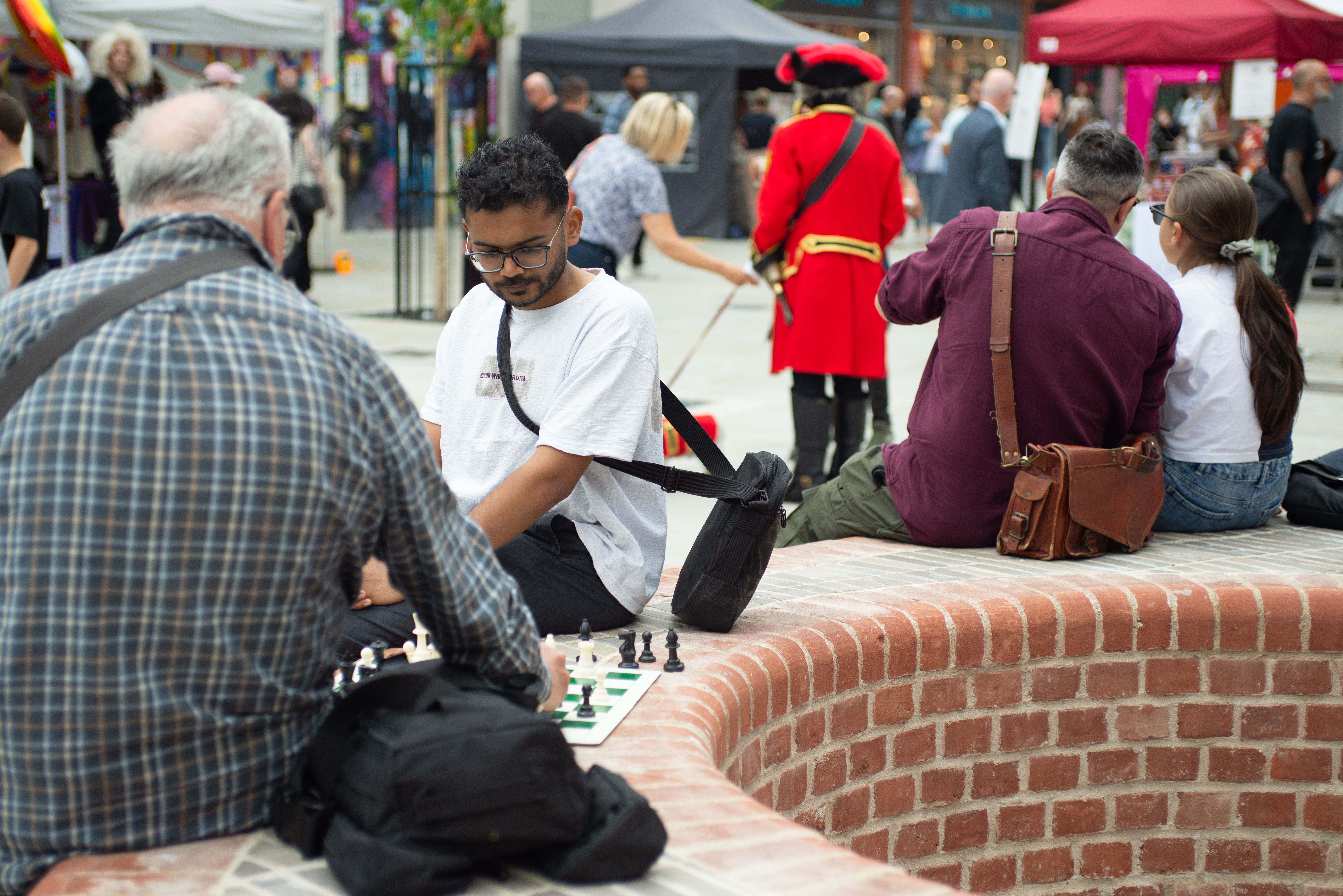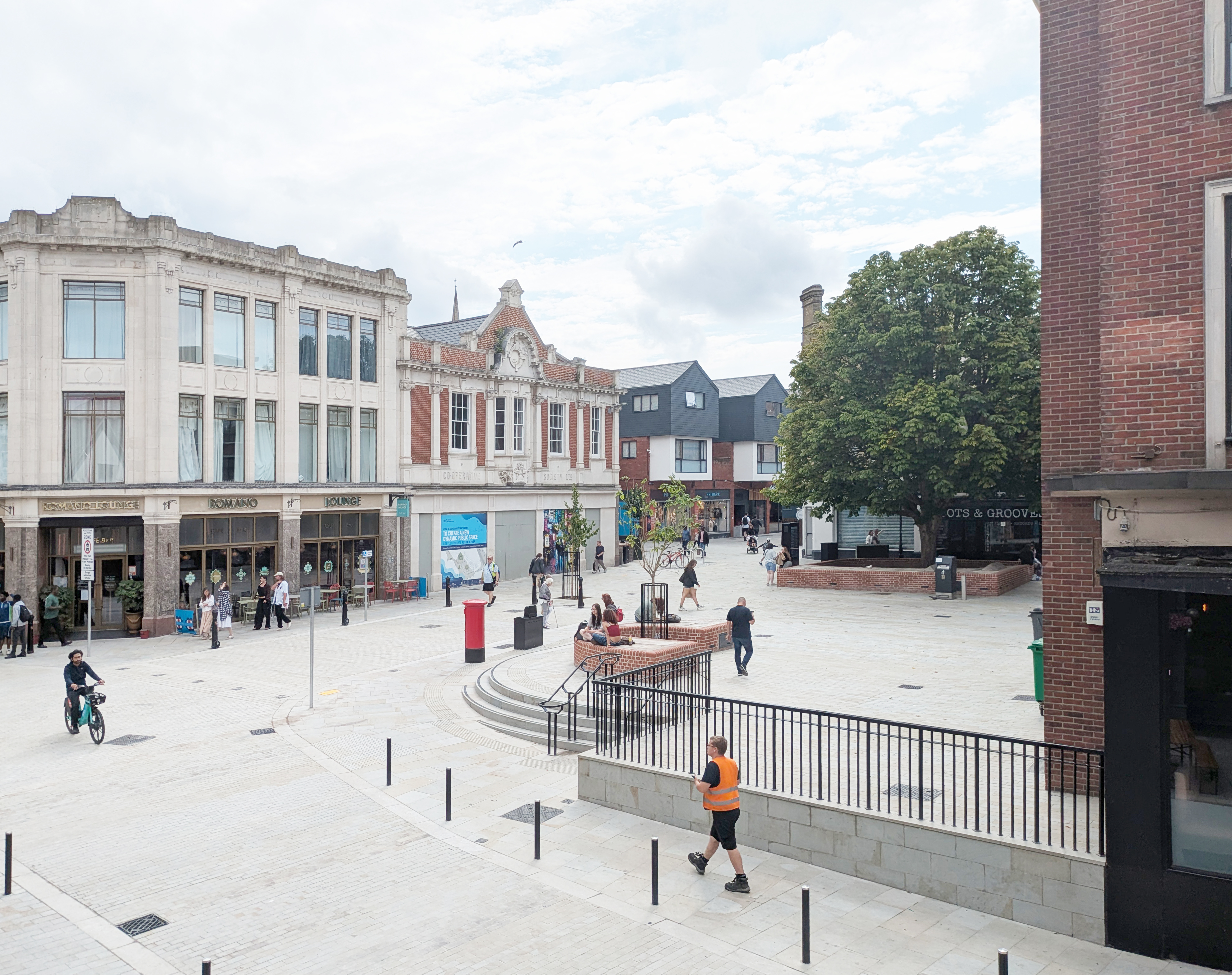 We are thrilled that our project at St Nicholas Square in Colchester celebrated its grand opening this weekend. The site was formerly the churchyard to a Sir George Gilbert Scott-designed church (demolished in 1955), and had become an unloved left-over space dominated by ad-hoc parking. It has now been transformed into an open and welcoming square for markets, events and the spill-out of the cafes, restaurants and bars that surround it.