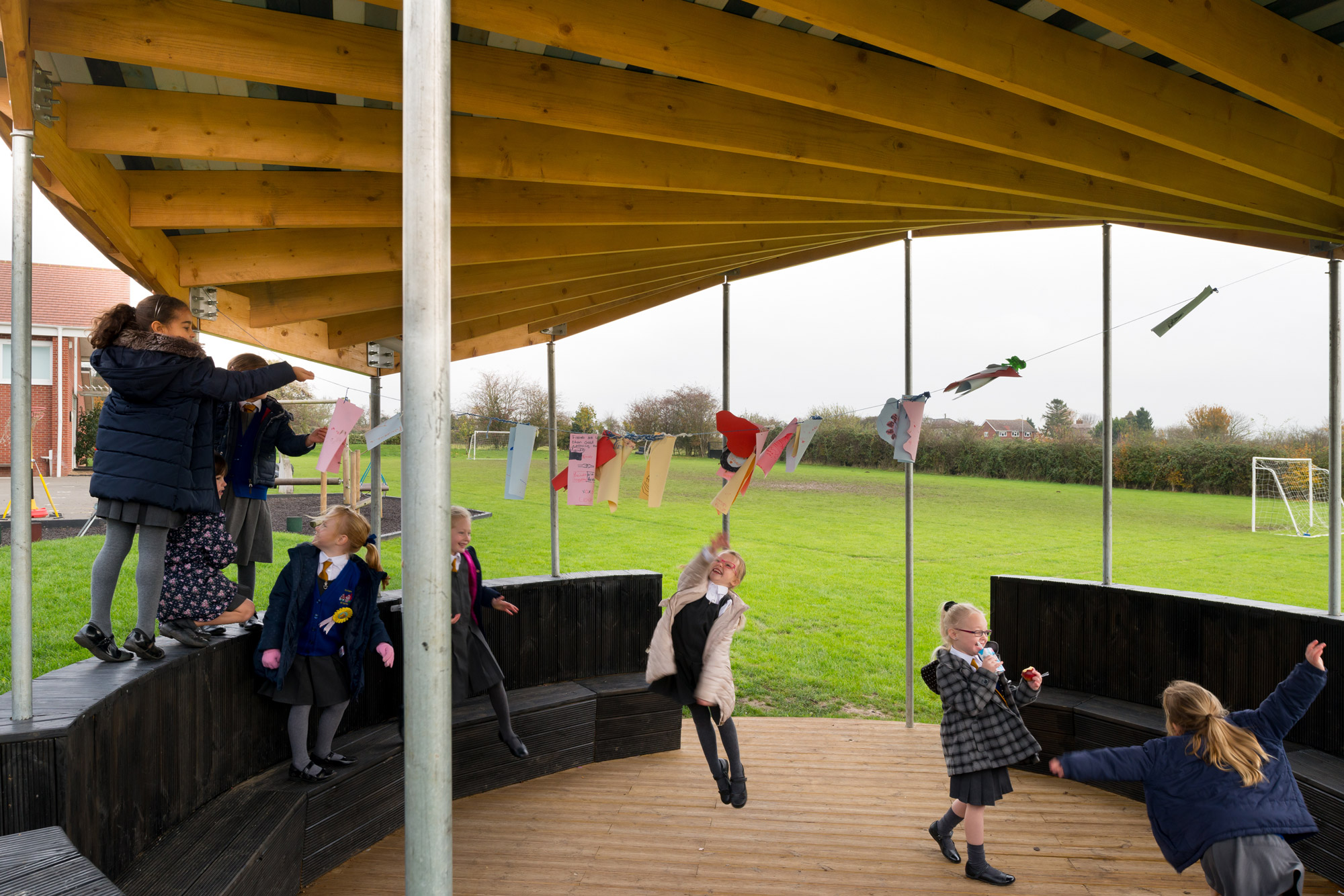 The new structure has a distinctive hyperbolic paraboloid roof that shelters a space that can be used by a class of 30 for anything from storytelling, environmental experiments, sports day and informal play. We took the opportunity to experiment with making a curving structure out of prefabricated timber elements, and you can read more about this here.