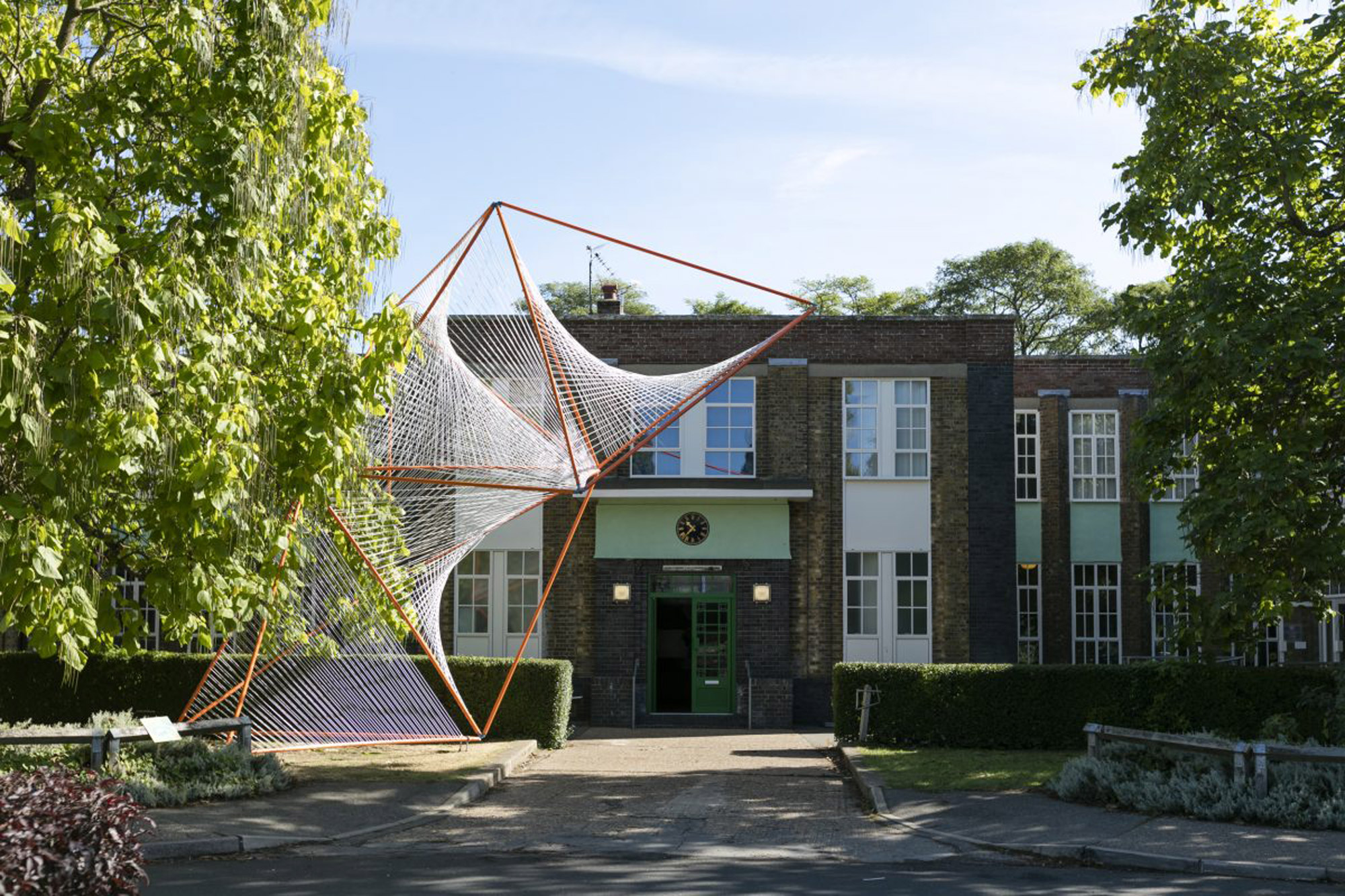 We were commissioned to create a temporary installation for Silver End Village Hall as part of the Radical Essex Architecture Weekend, curated by Focal Point Gallery. One of the pioneering sites for British Modernism, Silver End is a unique model village created by the Crittall family, of metal windows fame. We created a celebratory entrance installation that is influenced by modernist sculpture and graphic design, and experiments with lightweight engineering and large spans to create a big visual impact through an economy of means.