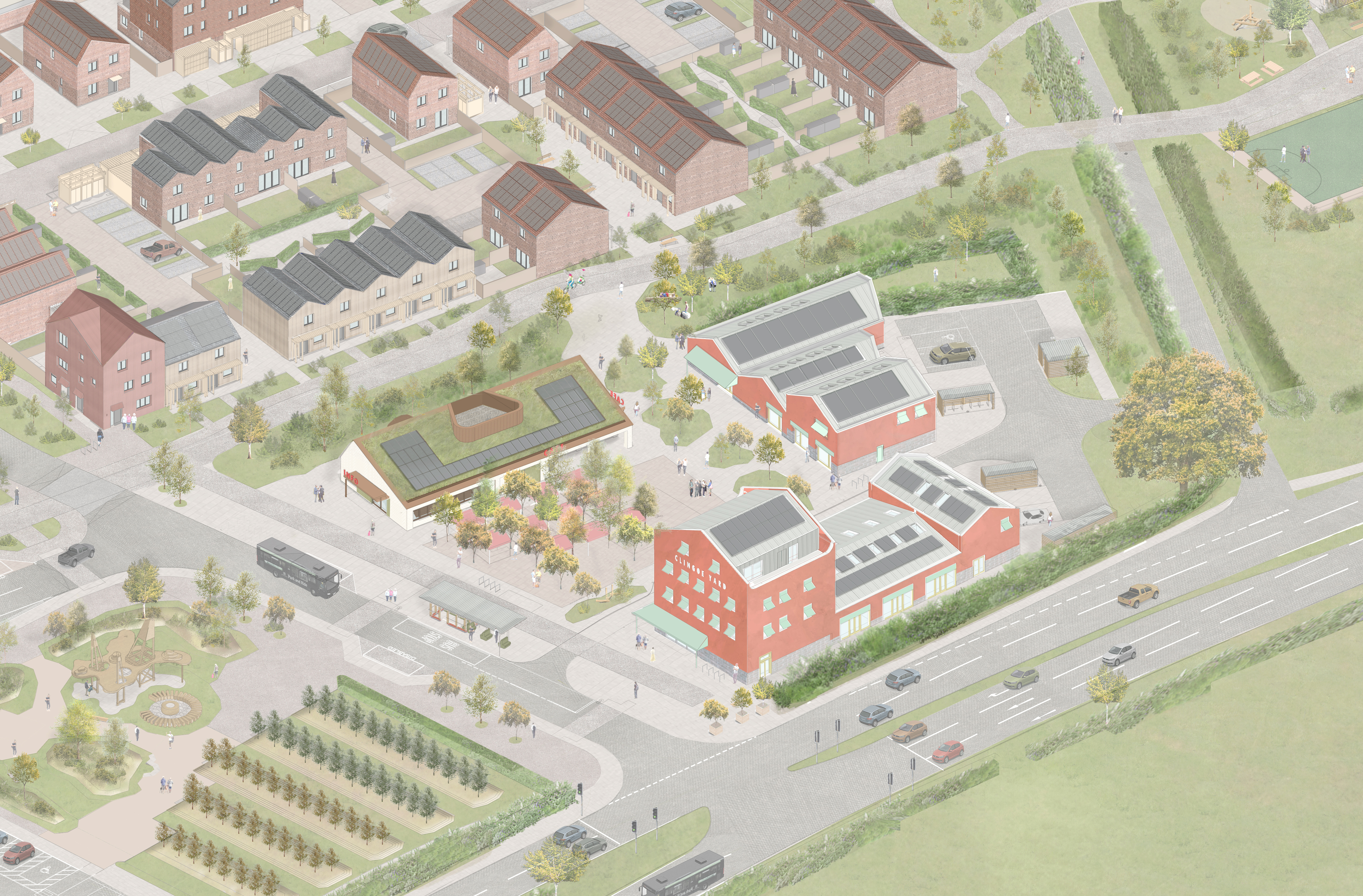 We are thrilled that the hybrid planning application for the Tendring Colchester Borders Garden Community, including our designs for Gateway Place, have been submitted for planning approval. We are particularly excited that Gateway Place – a group of community and workspace buildings around a new public square – will be the first phase to be constructed, a real signal of the intent to create a thriving and vibrant community that goes far beyond just the provision of new homes. Designed in regenerative and low-carbon materials, including hempcrete and stone, Gateway Place will serve both existing residents around the site – providing early years nursery, park-and-ride facilities, café and business units - and provide for the daily needs of the first new residents.