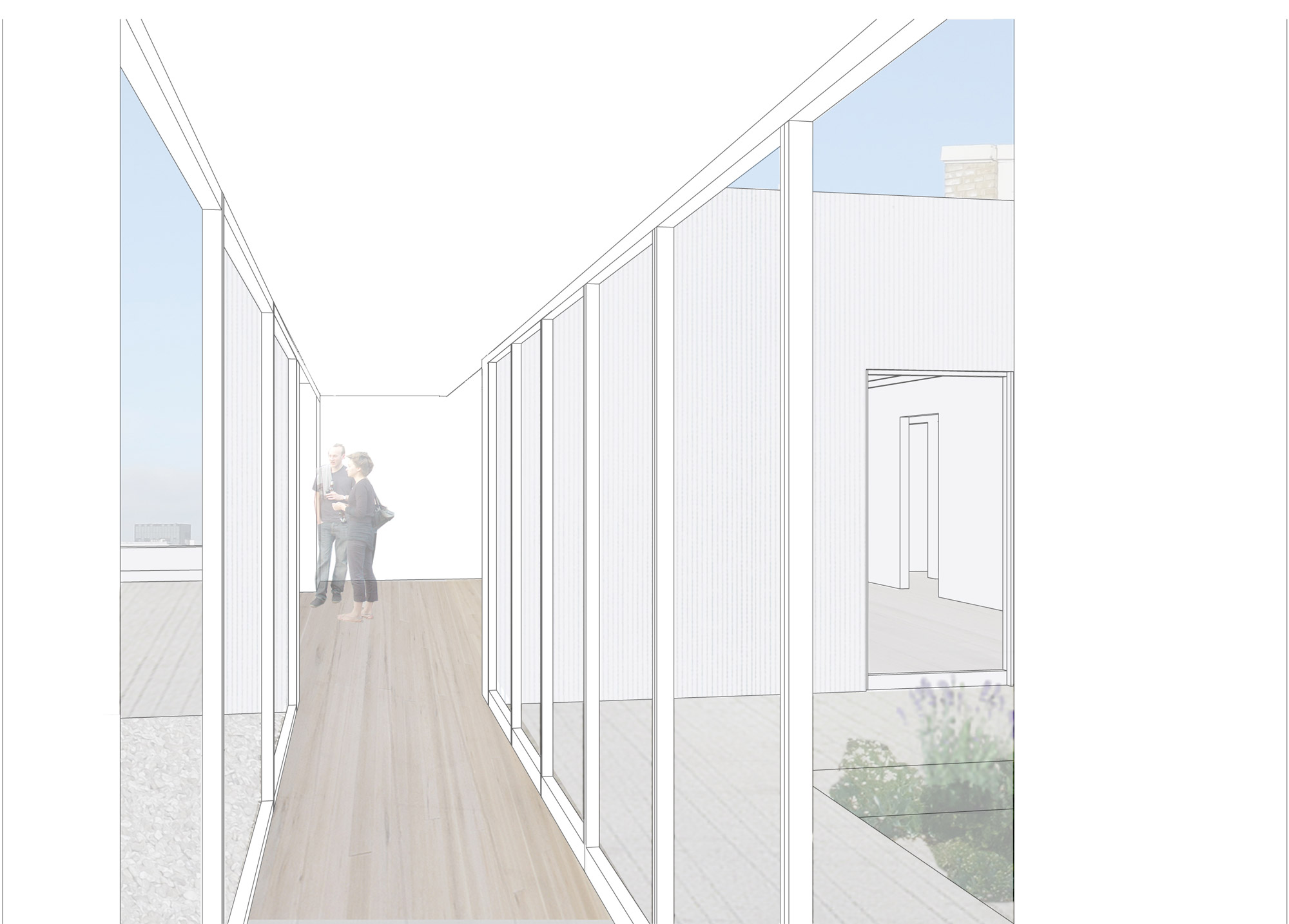 We have been commissioned by Acme Studios, one of our clients at High House Artists' Studios, to create a rooftop pavilion extension on top of their office and studio building in Mile End. Intended for events, seminars and informal staff use, it takes advantage of the extraordinary views from the roof. The design integrates the existing rooftop rooms and objects into a landscape of boardwalks and drought-resistant planting, while the pavilion itself is formally very simple, with a light, crisp but semi-industrial materiality.