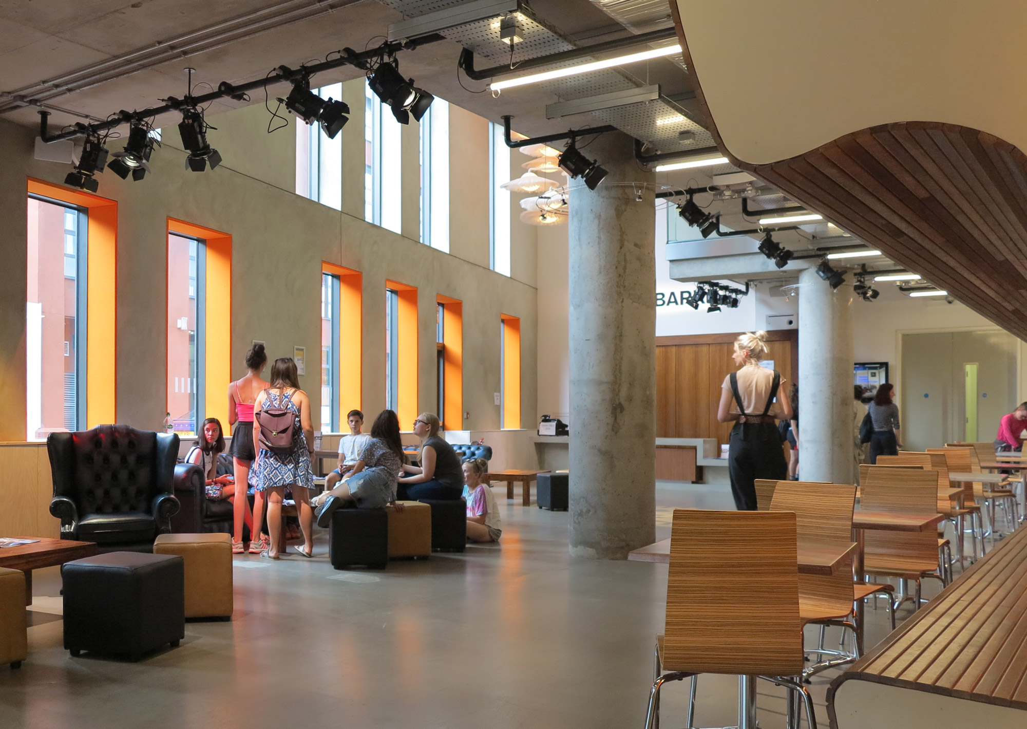 We worked with DanceEast to refresh their reception and foyer areas following a successful capital funding bid to Arts Council England. On a limited budget, we introduced a warmer material palette and layout changes enables the foyer to be used more flexibly for daytime and evening activities. Working with the in-house technical team to reduce costs, we designed new lighting, wall finishes and reception furniture to make a more welcoming interior, as well as new exterior signage and lighting to increase the building's public presence.
