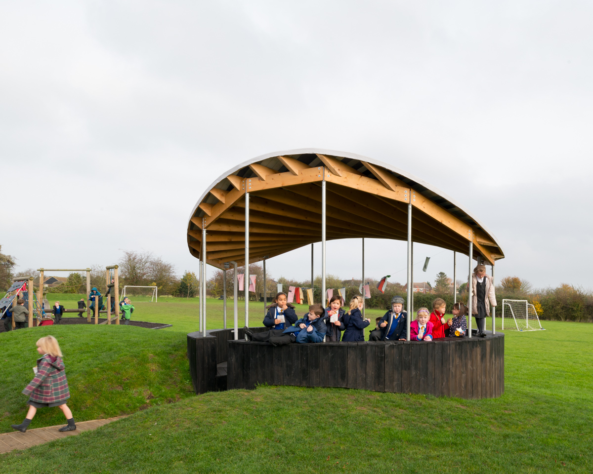 The new structure has a distinctive hyperbolic paraboloid roof that shelters a space that can be used by a class of 30 for anything from storytelling, environmental experiments, sports day and informal play. We took the opportunity to experiment with making a curving structure out of prefabricated timber elements, and you can read more about this here.
