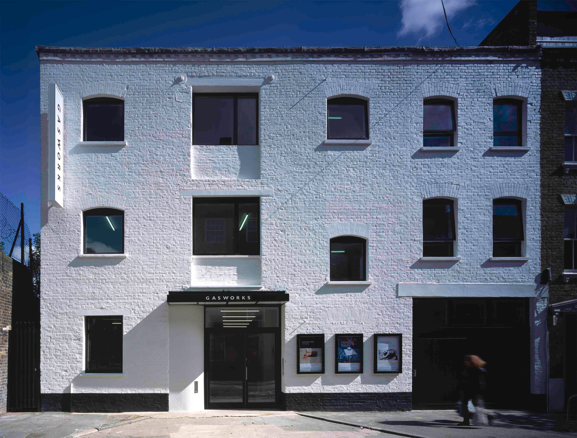 A striking street facade has been created from minor adjustments and new openings, working with the existing window placement. We worked with the black and white palette of Gasworks' visual identity to create a sharp and graphic elevation, enlivened at night by an oversized lightbox and an illuminated canopy over the entrance.