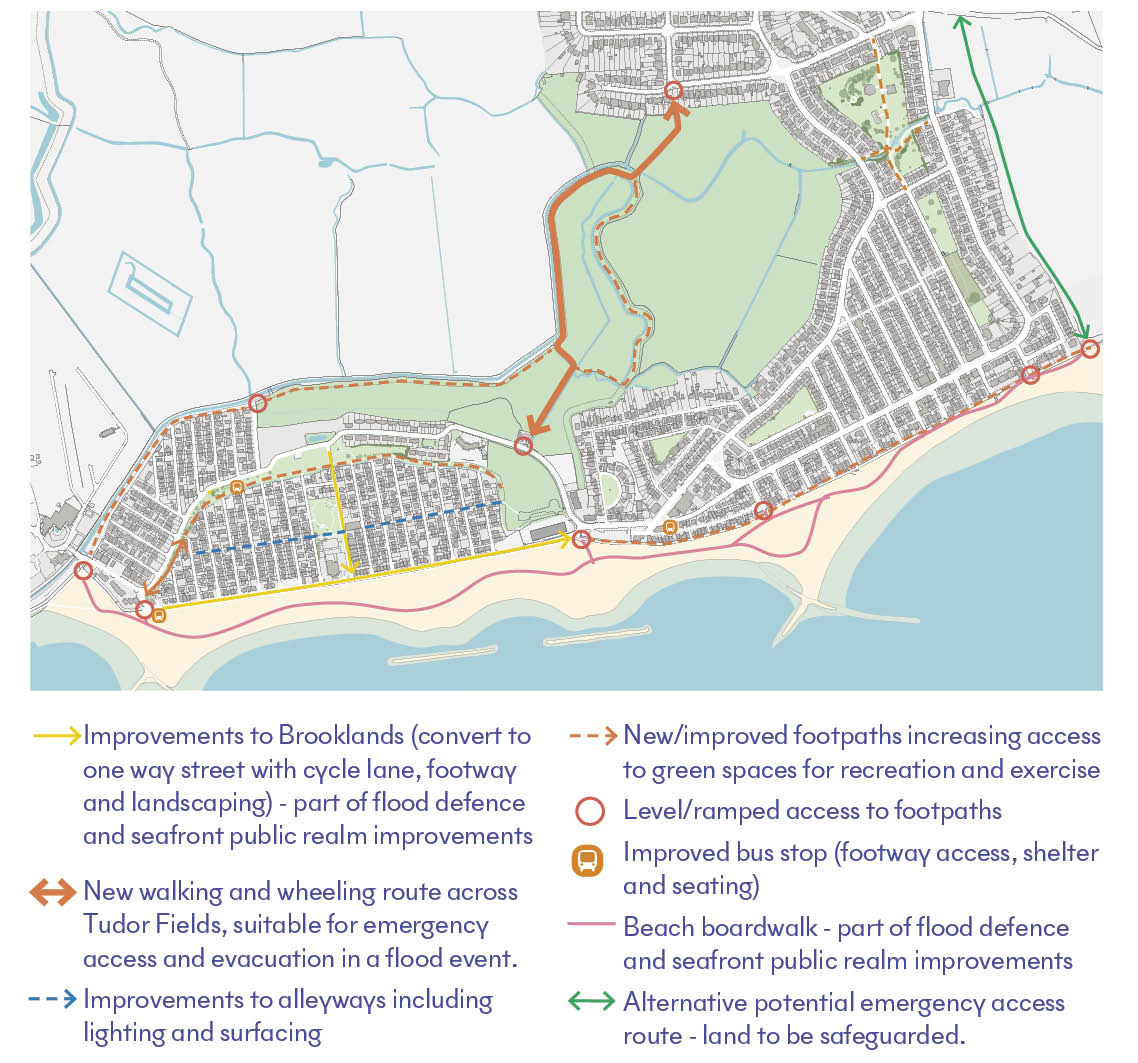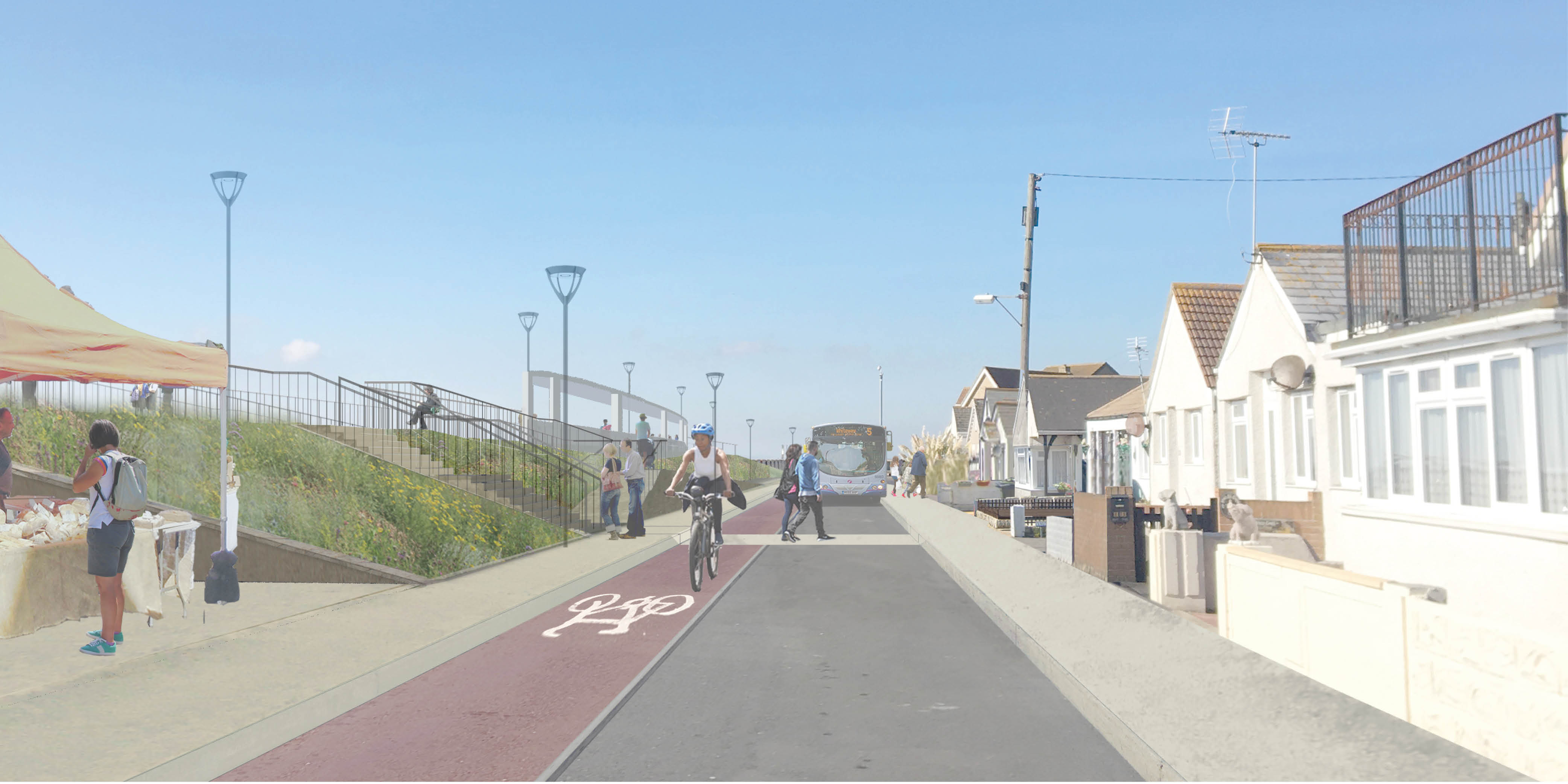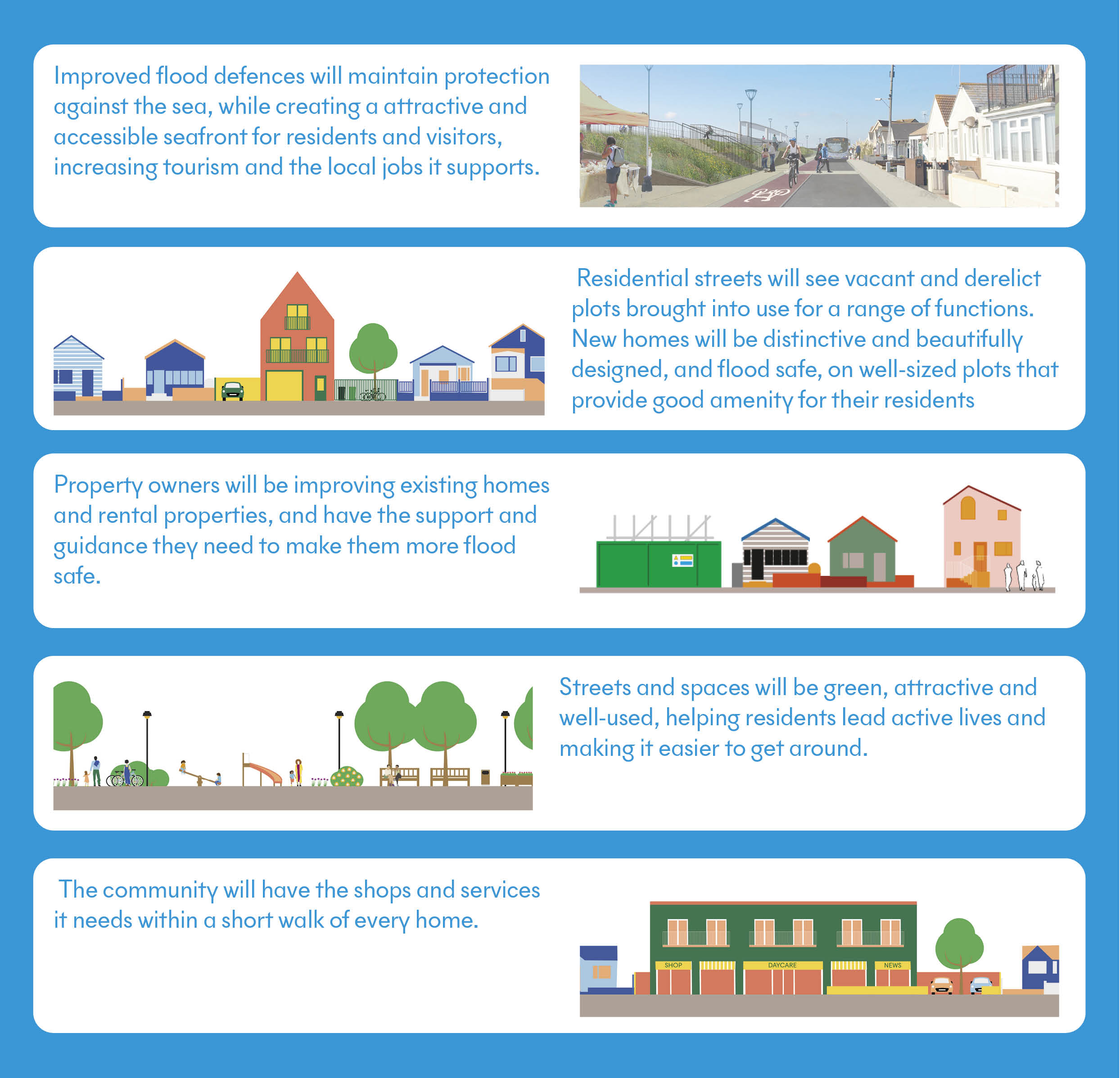 Commissioned by Tendring District Council, and working closely with a wide range of bodies including the Environment Agency, Essex County Council, Homes England and DLUHC, we have been working on a regeneration plan to improve flood resilience, housing quality and the wider built environment in Jaywick Sands since late 2018. Through many rounds of research, ideation and consulation with the community and other partners, we have developed a comprehensive strategy that retains what is special about Jaywick, proposes new infrastructure that will both improve flood defences and improve the accessibility of the beach and oportunities for tourism, and addresses the improvement of poor quality homes through working with property owners as well as through redevelopment of abandoned plots by the Council itself.