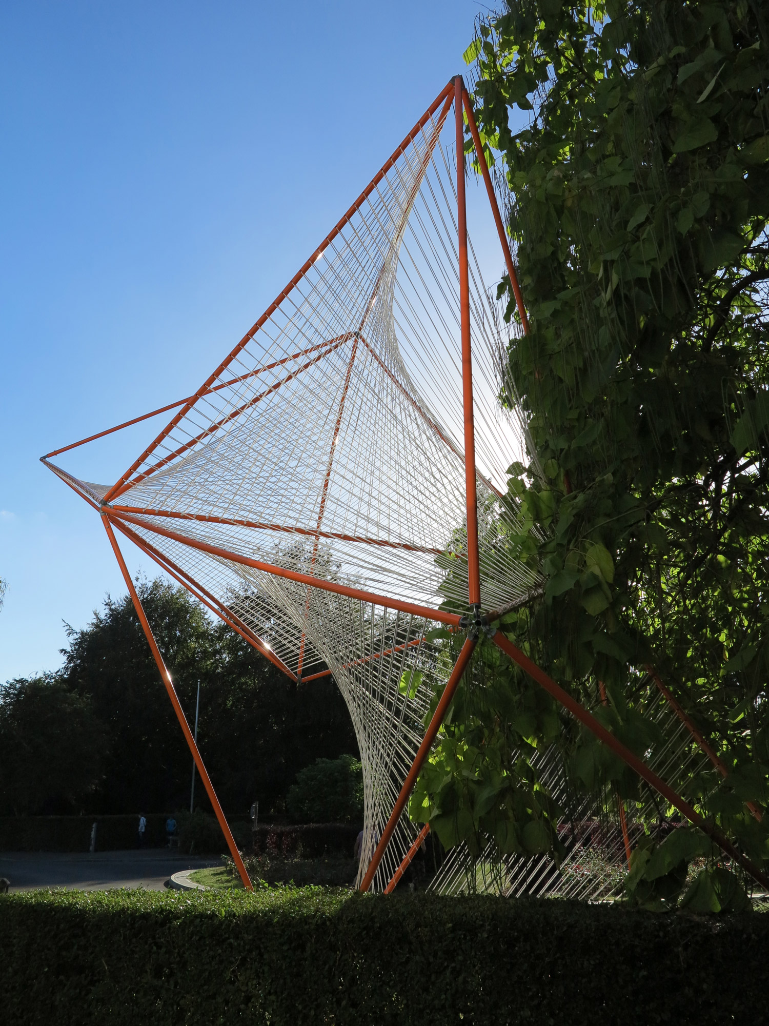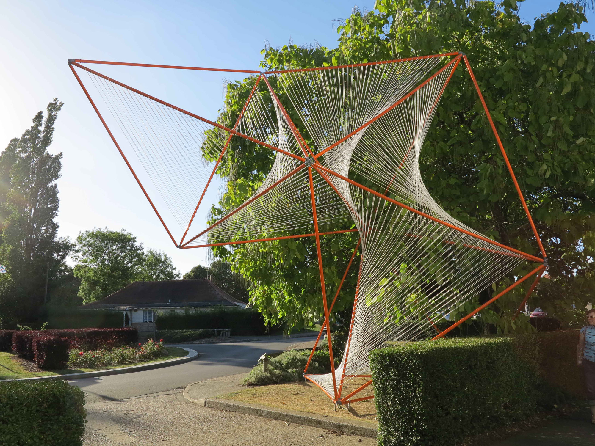We were commissioned to create a temporary installation for Silver End Village Hall as part of the Radical Essex Architecture Weekend, curated by Focal Point Gallery. One of the pioneering sites for British Modernism, Silver End is a unique model village created by the Crittall family, of metal windows fame. We created a celebratory entrance installation that is influenced by modernist sculpture and graphic design, and experiments with lightweight engineering and large spans to create a big visual impact through an economy of means.