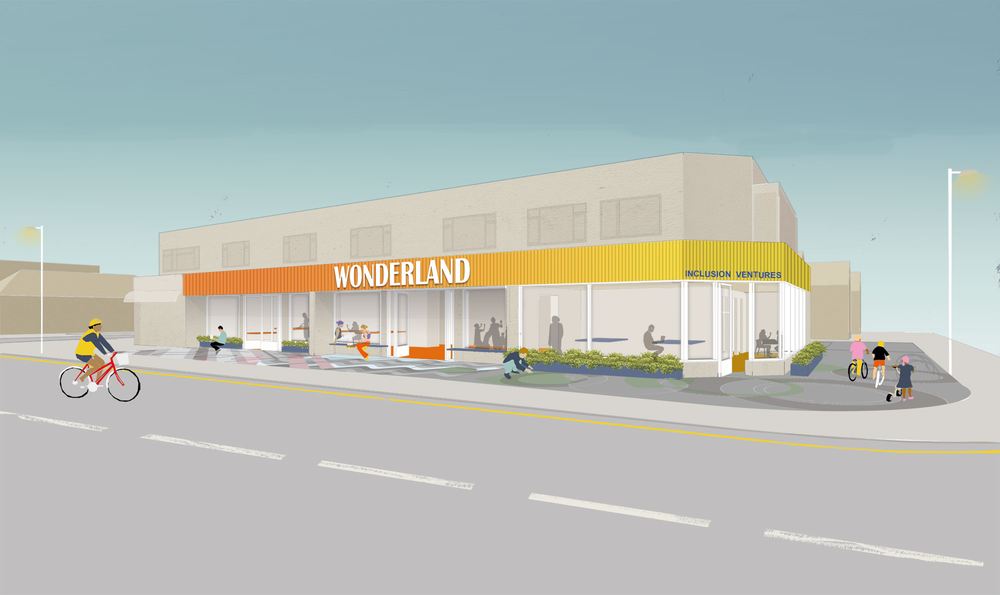 The project presents an immensely exciting opportunity to transform one of the most prominent sites in Jaywick into a buzzing community hub. With great street presence and a wide area of pavement within the site boundaries, the activity can spill out into the street and animate the public realm. Inside a series of multi-functional spaces can accomodate Inclusion Ventures key activities, including a community cafe and training kitchen, activity space for physical games, dance and recreation, training room and therapy/music editing suite.