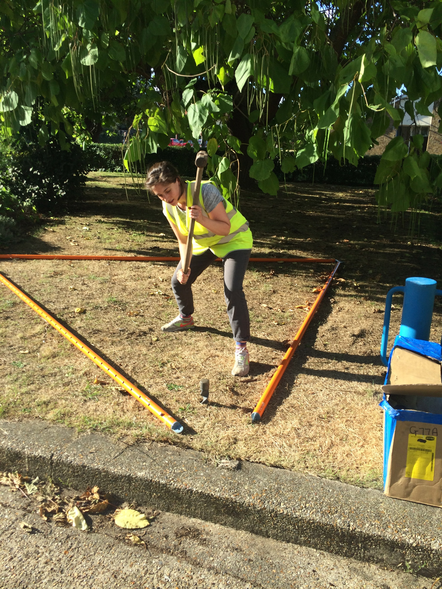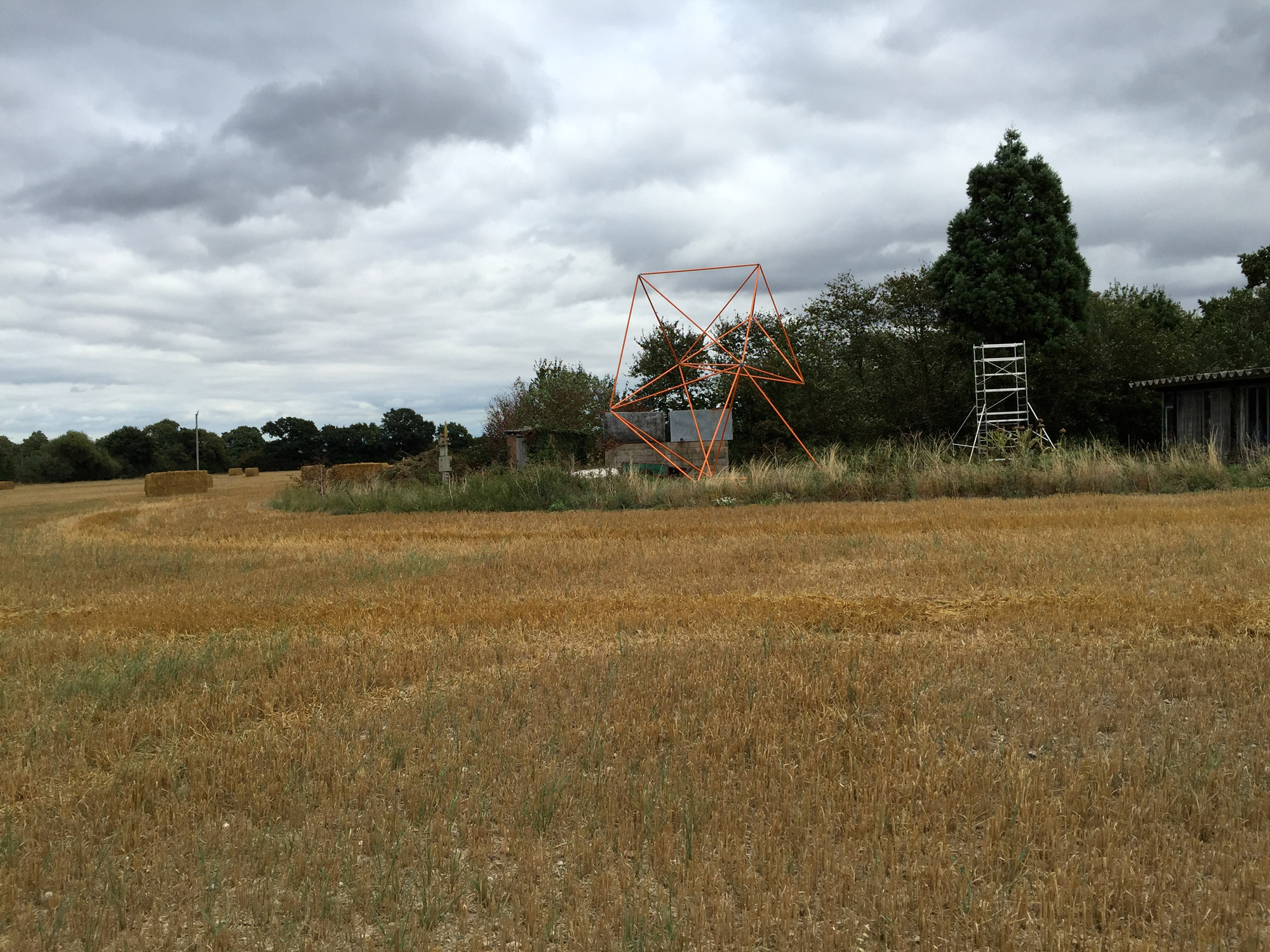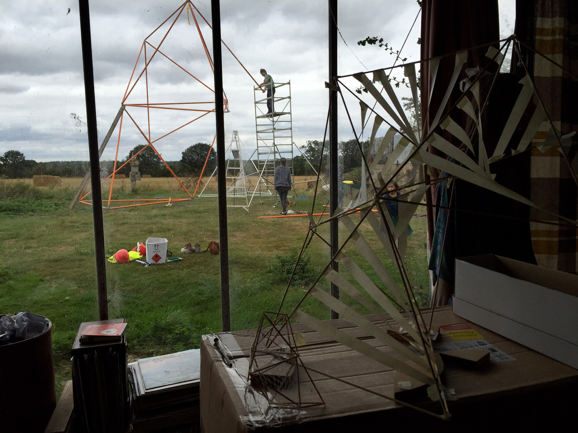 When we were commissioned by Focal Point Gallery to create an installation for their first Radical Essex weekend, we quickly established that we wanted to make something of significant visible scale without using lots of materials or money to get there. We got interested in nodal, lightweight frame structures as well as the string sculptures of Naum Gabo and Barbara Hepworth, which created or suggested space and form while using minimal material to do so. We loved the idea of something that could be packed away into a kit of very little parts, and could be used again and again.