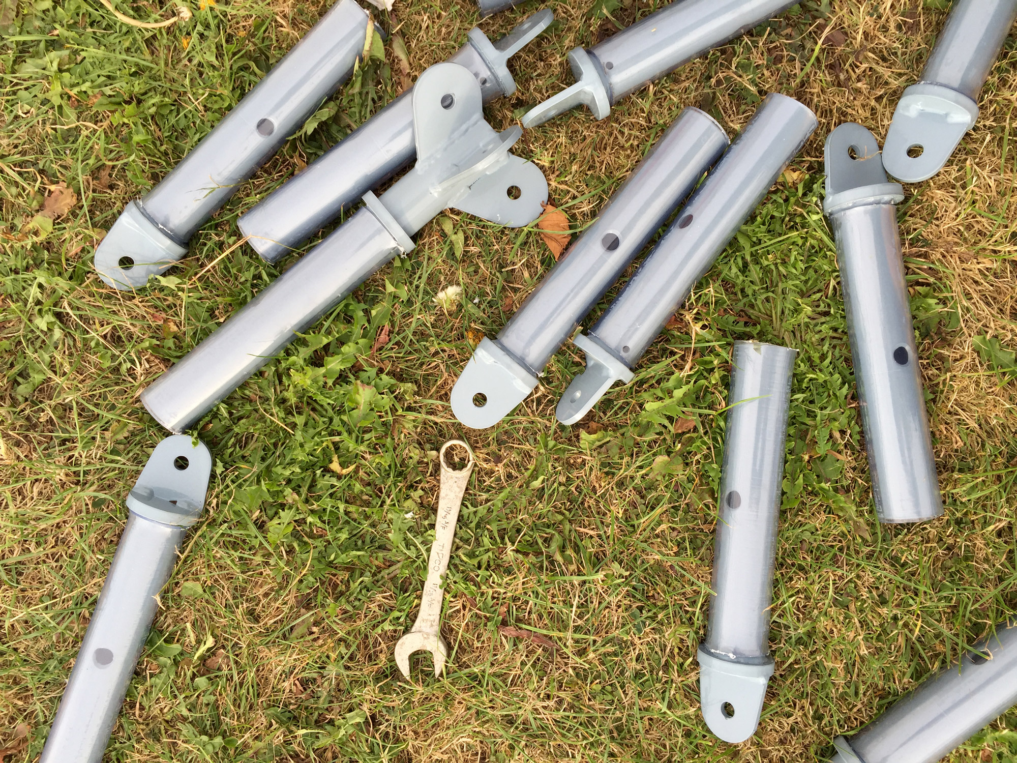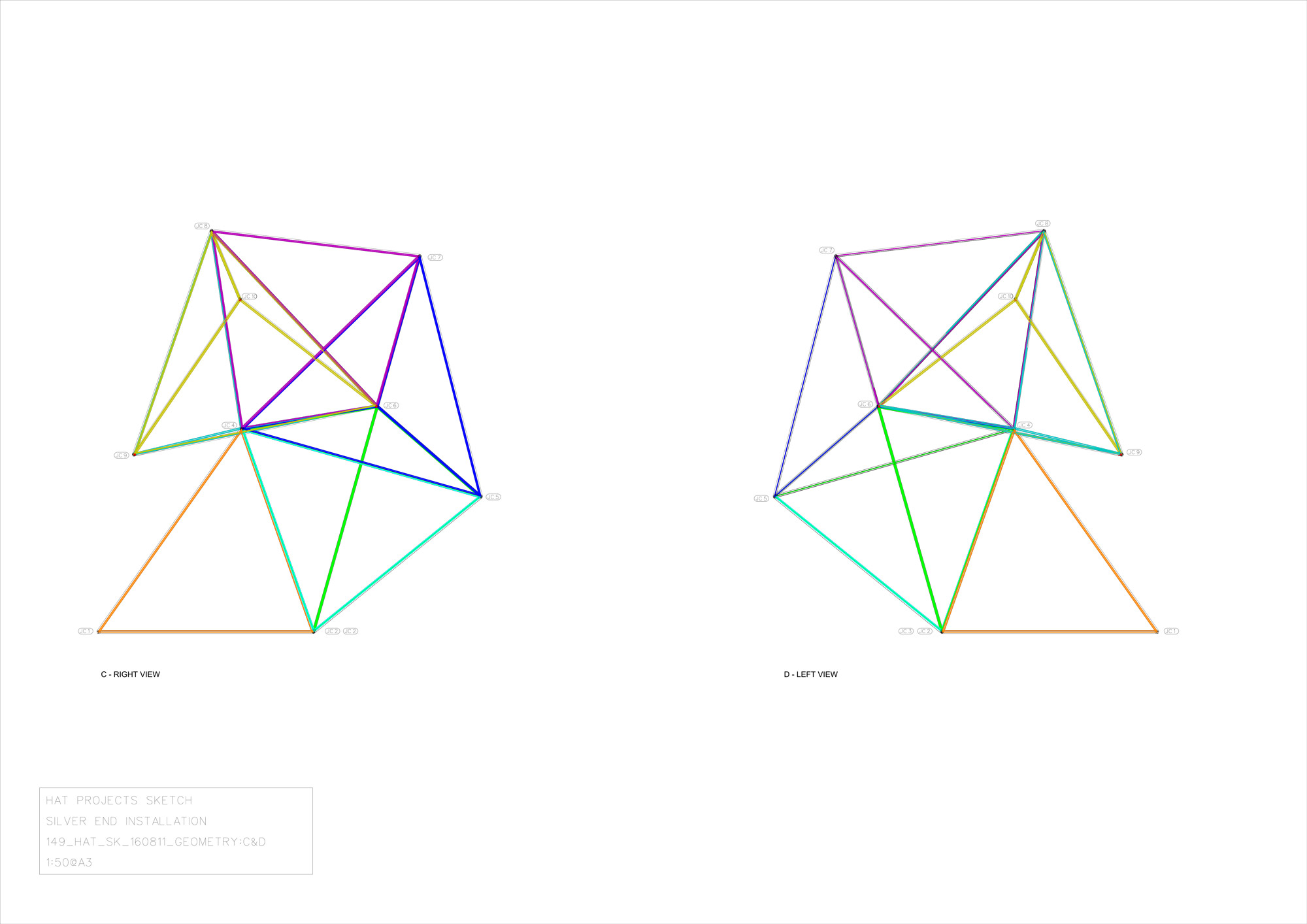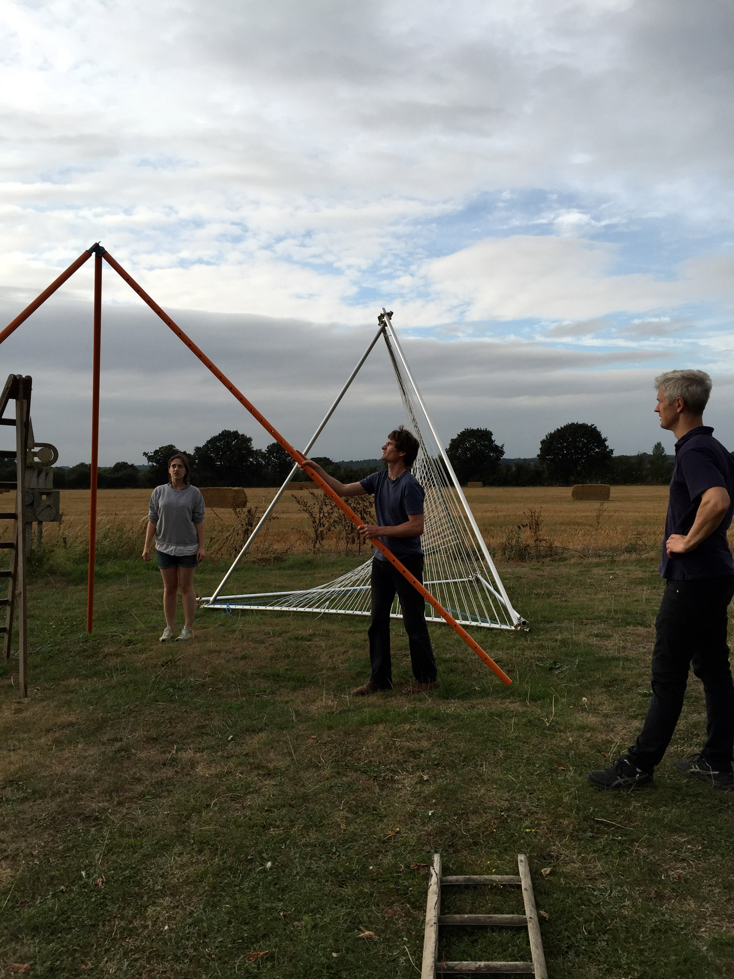 With very little time to develop the project, we worked iteratively between models and drawings, and full scale mock-ups to establish how best this could be realised. We would only have one day on site to erect the real thing so we knew nothing could go wrong. With our regular collaborator Thomas Goodey, and our local fabricators Wesbroom, we started with scale models and small mockups, then made an initial test mockup of a single tetrahedron, and finally erected the whole structure for a test run out in the fields by Thomas’s studio. We developed a multi-flanged connector and experimented with different kinds of shockcord to create a taut string effect, while being secure and easy to install.